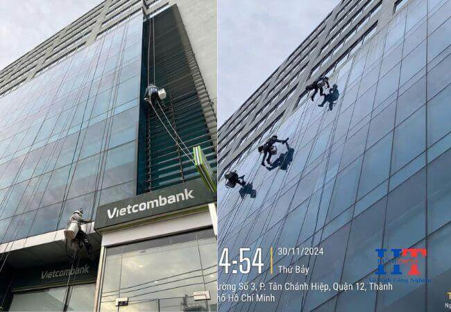 Phương pháp đu dây: Sử dụng hệ thống dây cáp và thiết bị đu dây chuyên dụng để tiếp cận các bề mặt kính khó tiếp cận. Phương pháp này phù hợp với các tòa nhà cao tầng có kiến trúc phức tạp.