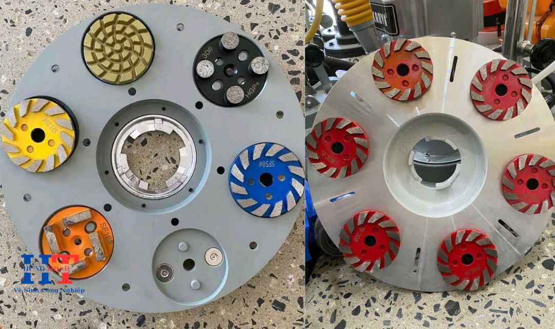 Máy mài sàn bê tông: Được sử dụng để mài nhẵn, loại bỏ các khuyết tật trên bề mặt sàn, tạo độ phẳng và chuẩn bị cho các công đoạn tiếp theo như đánh bóng hoặc phủ sơn.